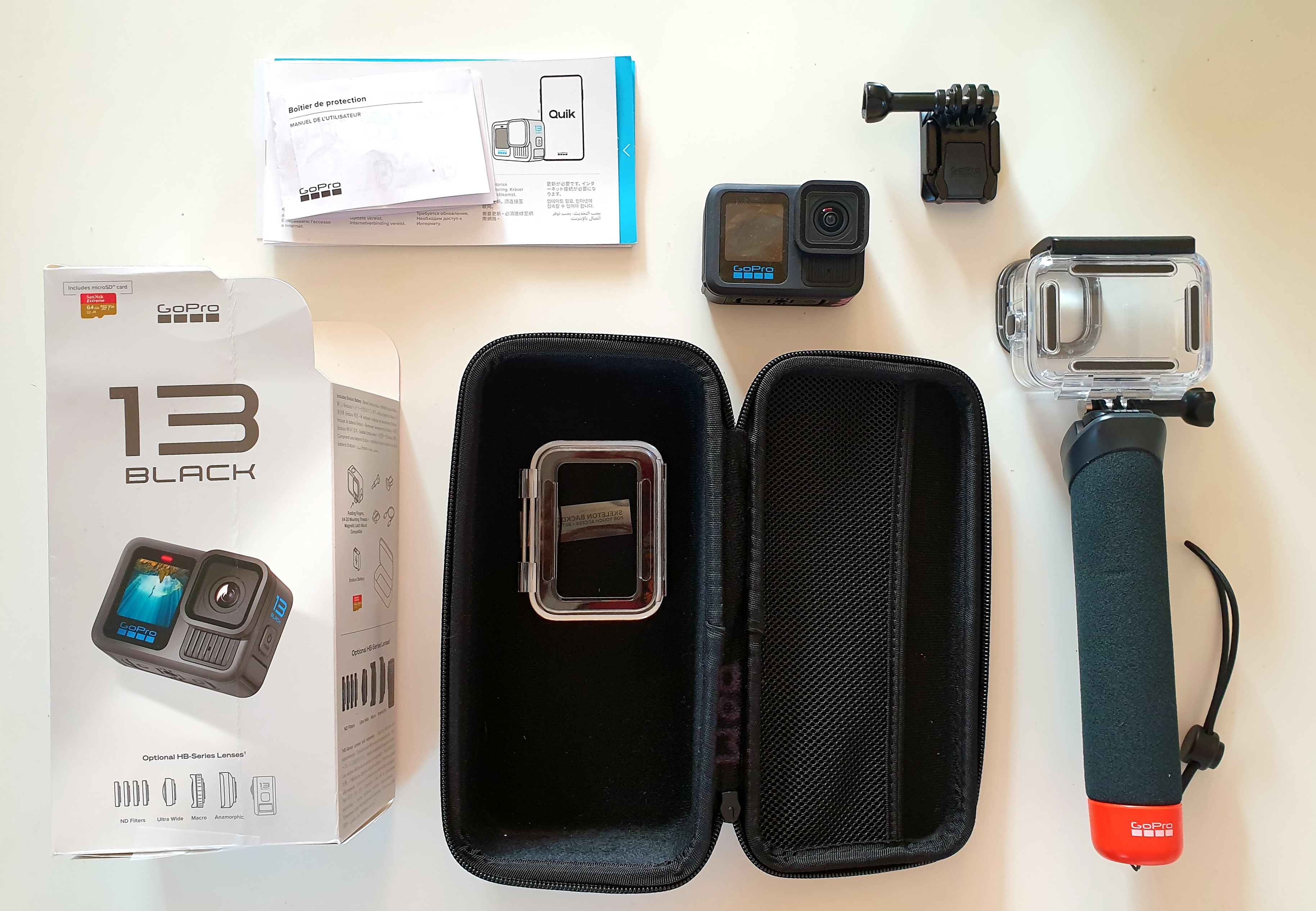 GoPro BLACK13 dernier modèle avec caisson étanche jusqu'à 60 mètres, étui, poignée flottante, carte micro SD 64 GB.